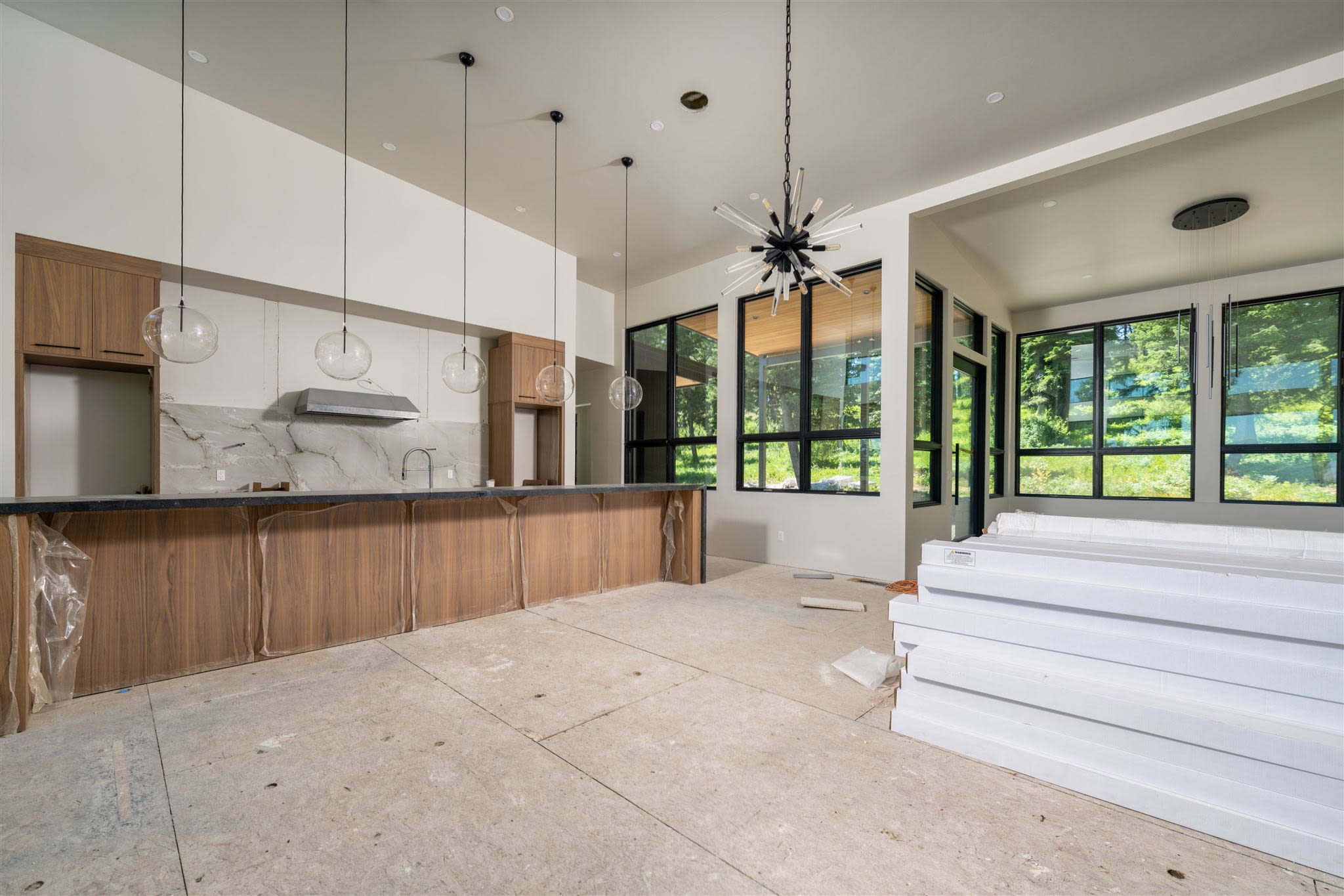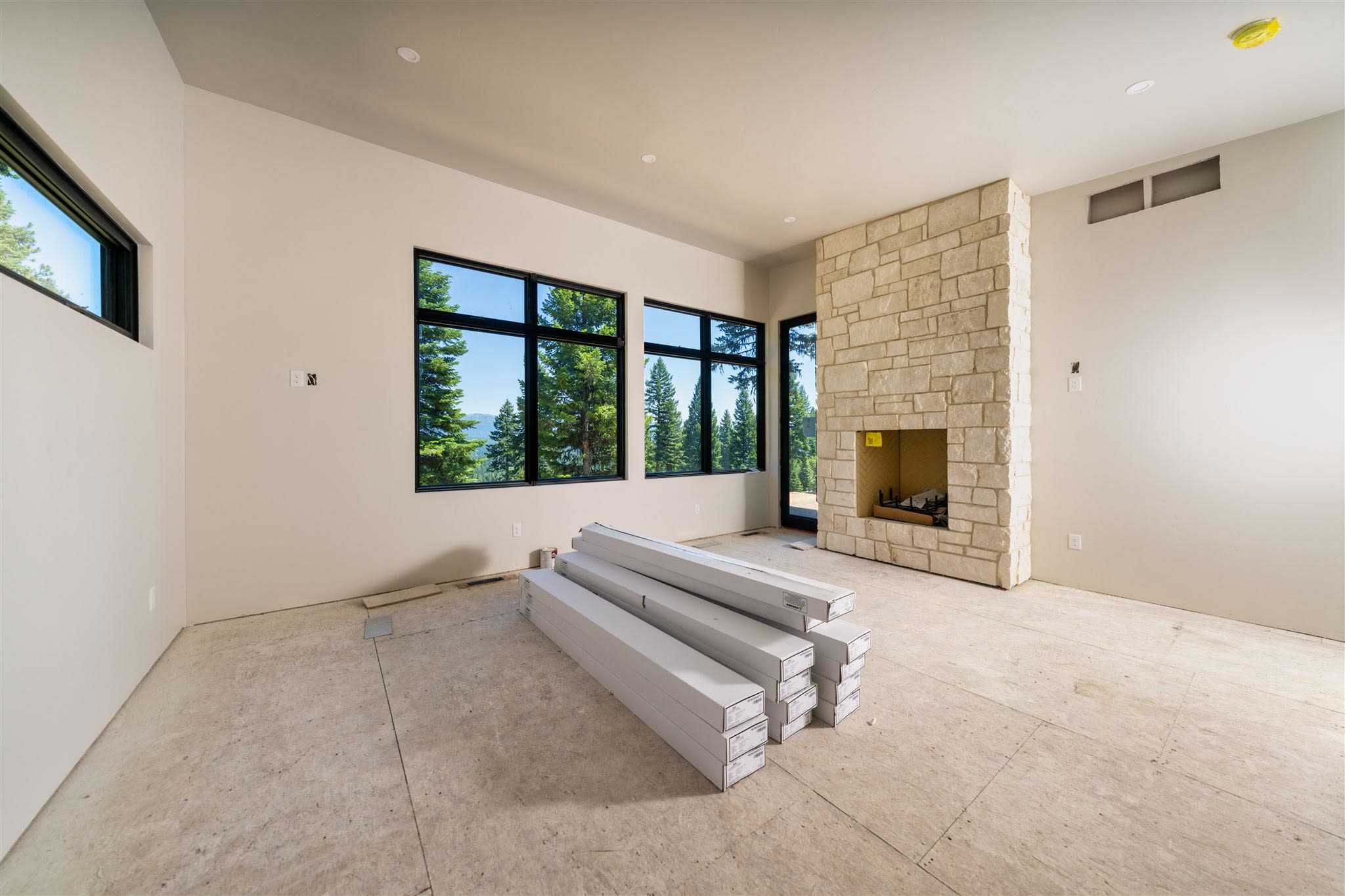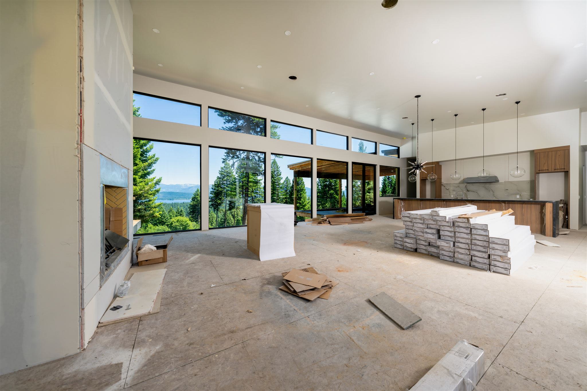 The main floor features an open-concept living area where the kitchen's marble backsplash, wooden cabinets, marble island countertop, and chic light fixtures have been installed. Within the great room, the fireplace has been added for a cozy living space during McCall's deep winters. And with awe-inspiring views of Ponderosa Pines and glimmers of Payette Lake, the outdoor terrace is near completion to ensure you have an area to host and entertain.