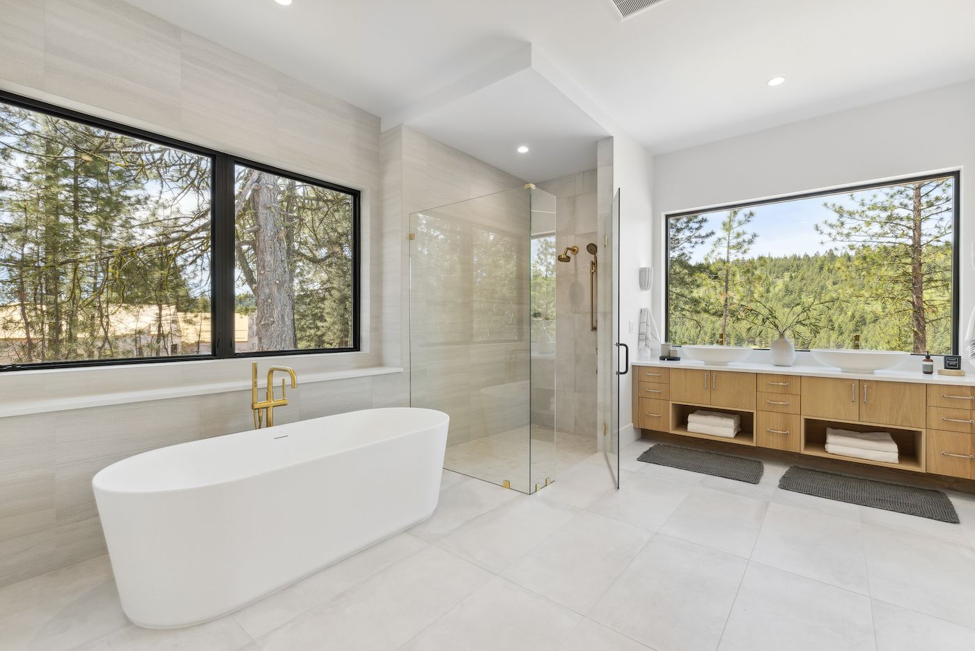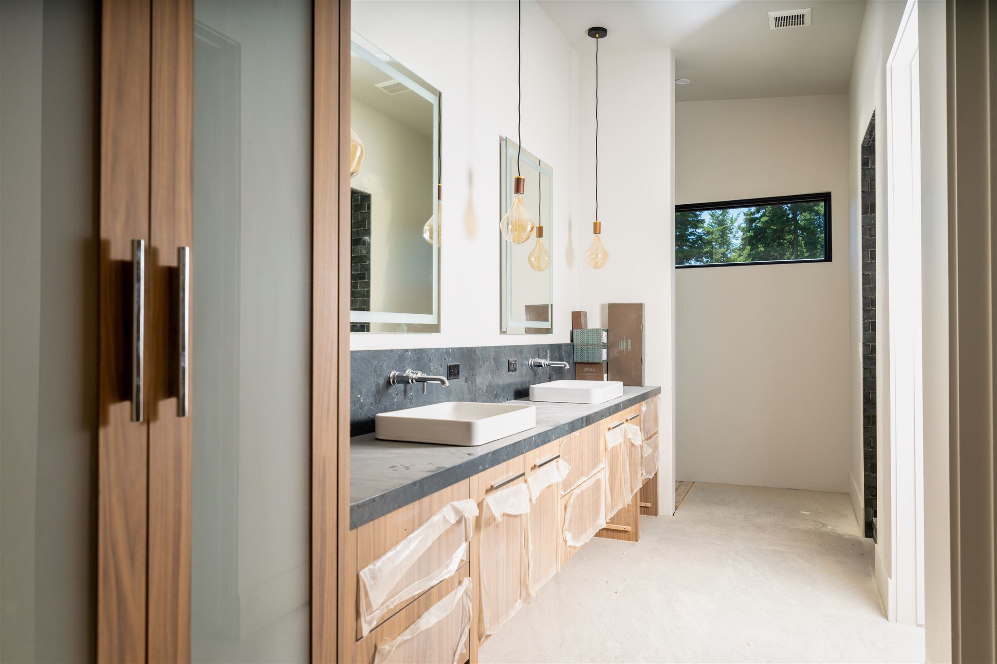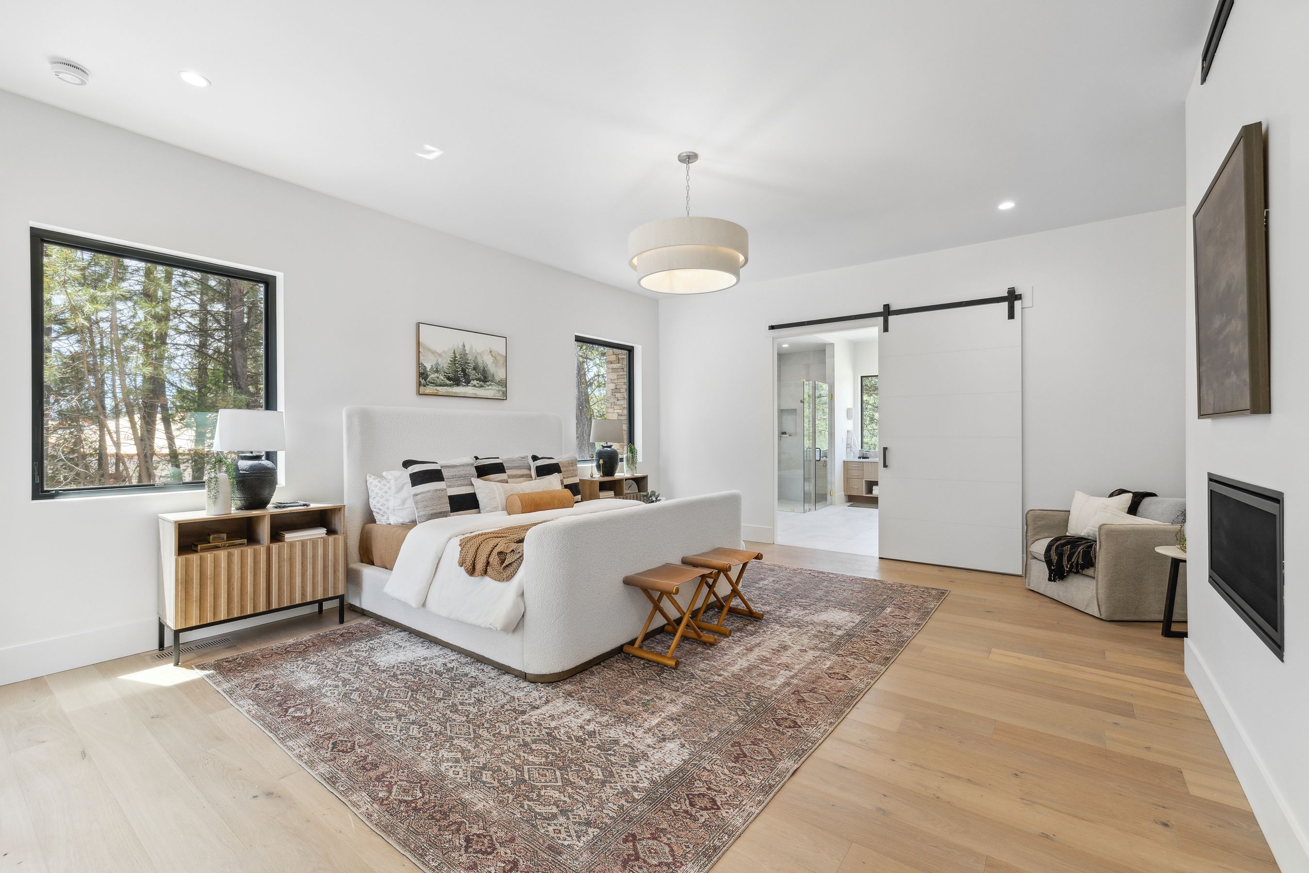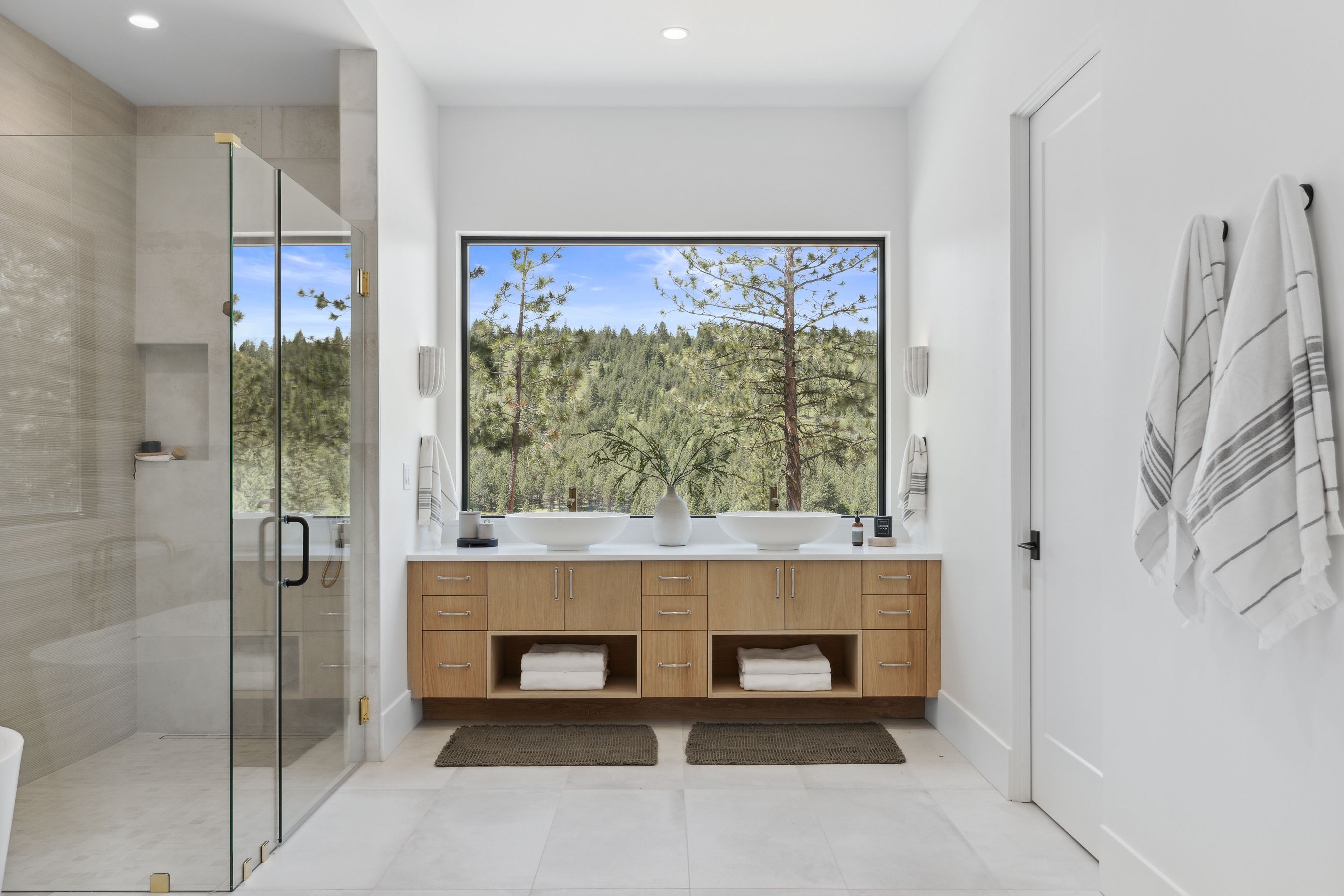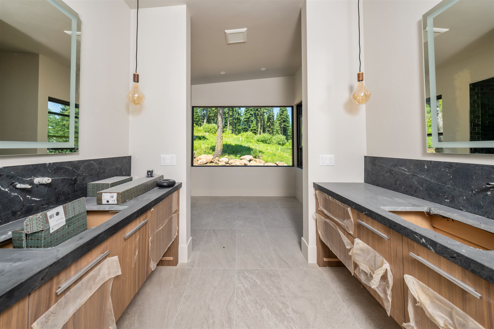 One of the most extraordinary features of this home is the primary bathroom. Featuring suspended mirrors, the back wall behind the vanity is a glass window allowing unobstructed views of soaring Ponderosa Pines. All that remains to complete this spectacular estate is the installation of the driveway and landscaping, which should be completed before the end of July. Make it yours today.