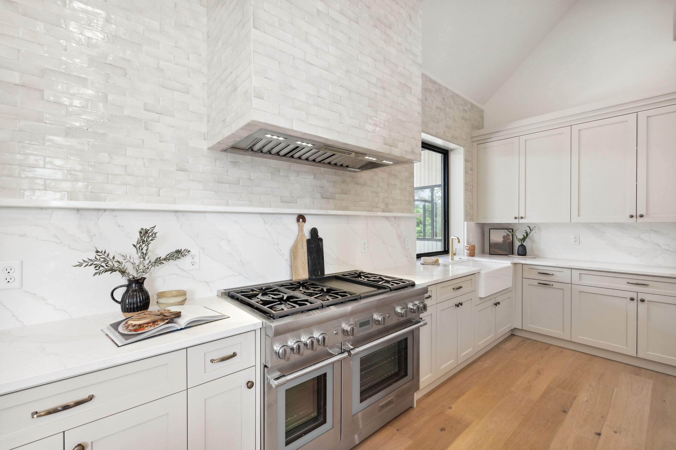 The open-floor living design is inviting and bright. It features a vaulted ceiling for a visually striking impact and framed oversized windows and sliders to maximize the natural lighting that seeps into the home. Equipped with a six-range gas stove, marble kitchen island, concealed pantry and prep area, and a breakfast nook to enjoy your morning beverage of choice while overlooking the magnificent views, the kitchen is as stunning as it is practical.