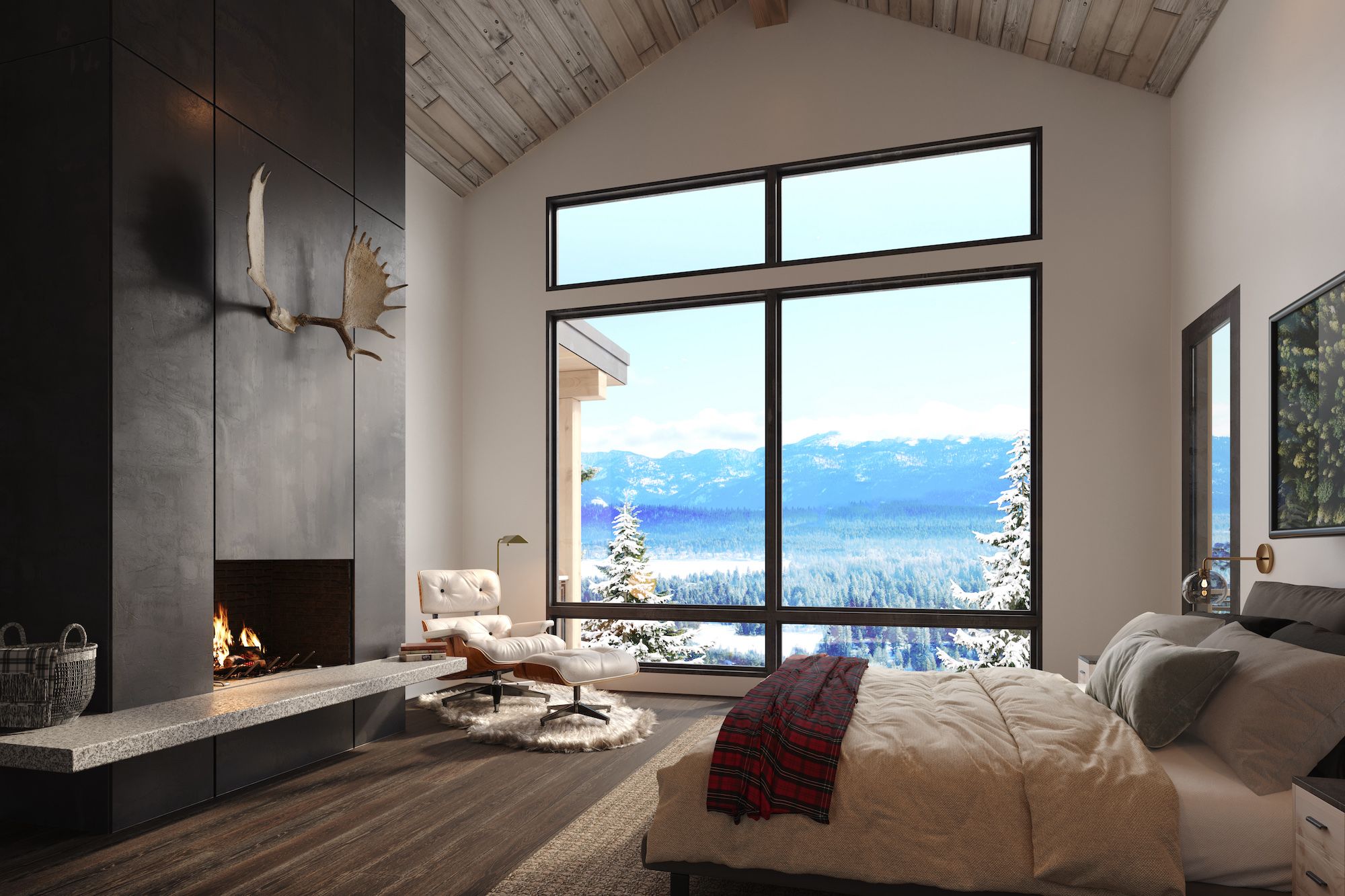 An opulent master suite featuring a floor-to-ceiling fireplace, ensuring a cozy retreat during the winter season.