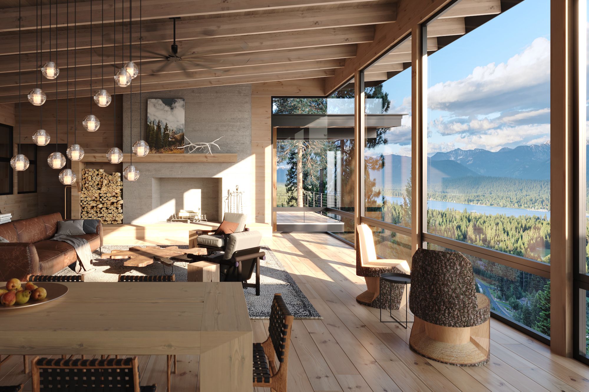 An open living room and kitchen design that offers breathtaking views of the Salmon River Mountains and Payette Lake.